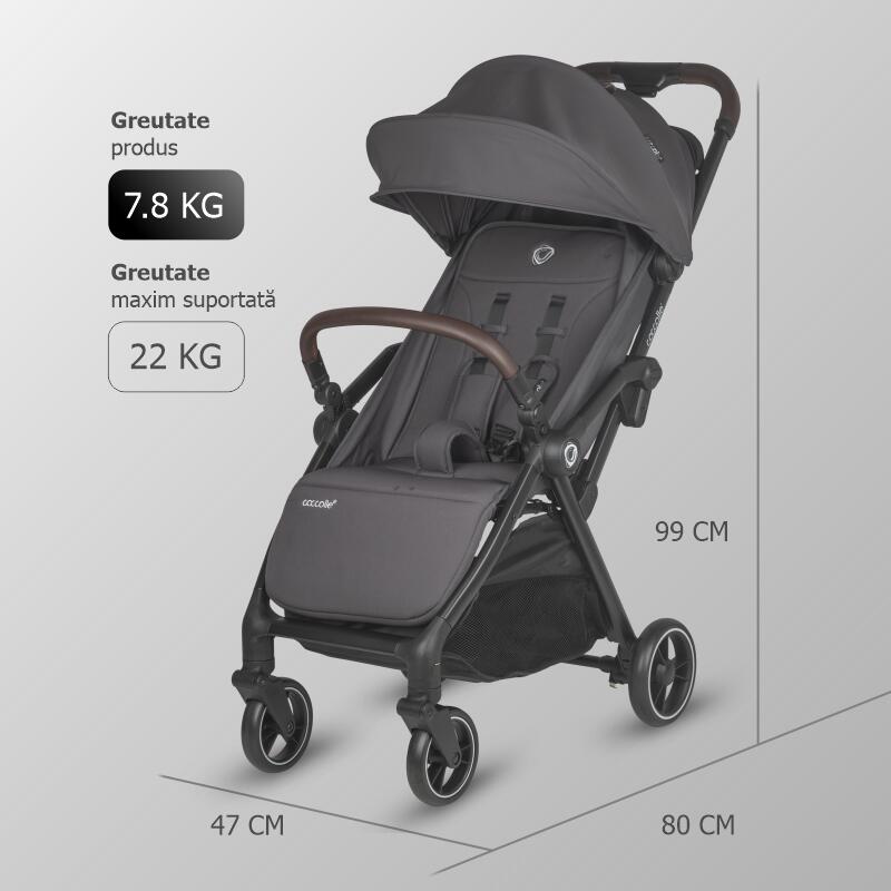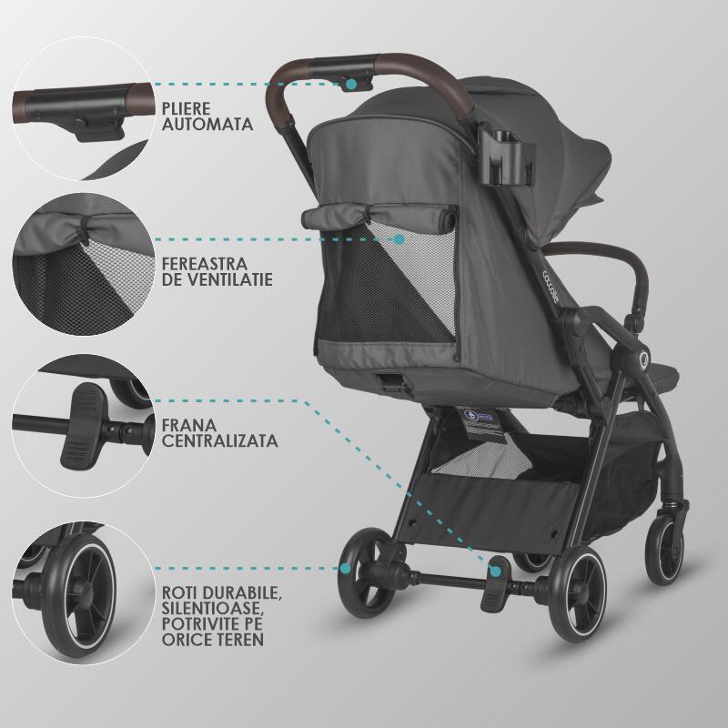 Caruciorul Arella are functia de pliere automata. Prin apasarea simpla si comoda a doua butoane, produsul se pliaza rapid si ocupa putin spatiu, astfel ca poate fi luat in orice calatorie sau folosit in orice imprejurari. Cu o greutate de doar 7.8 kg, caruciorul poate fi manevrat foarte usor si isi va gasi locul chiar si in cele mai mici locuinte sau masini. Rotile sunt realizate dintr-un material rezistent care asigura plimbari line pe orice tip de teren.