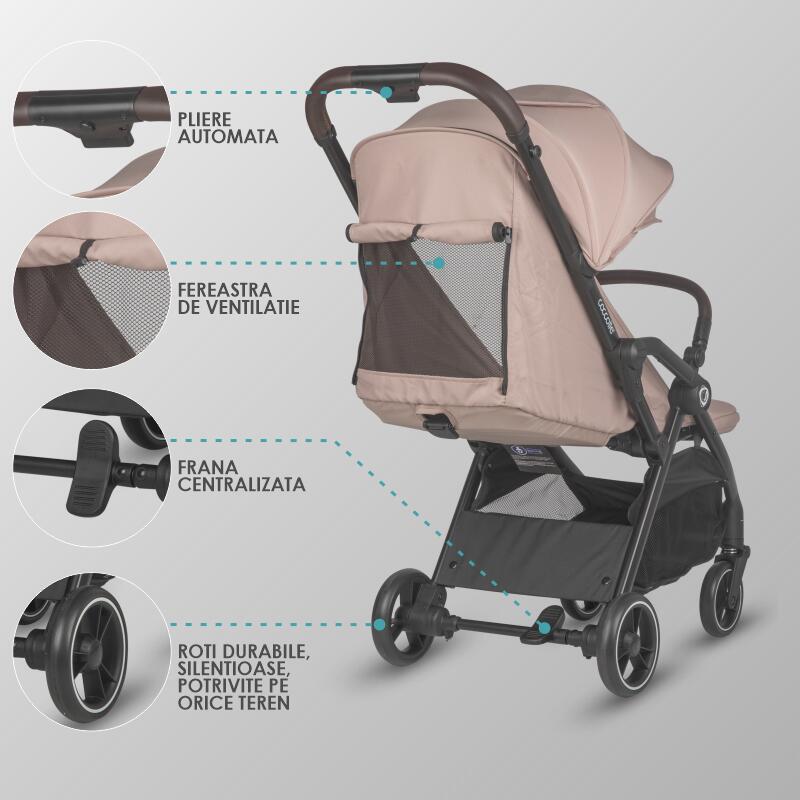 Caruciorul Arella are functia de pliere automata. Prin apasarea simpla si comoda a doua butoane, produsul se pliaza rapid si ocupa putin spatiu, astfel ca poate fi luat in orice calatorie sau folosit in orice imprejurari. Cu o greutate de doar 7.8 kg, caruciorul poate fi manevrat foarte usor si isi va gasi locul chiar si in cele mai mici locuinte sau masini. Rotile sunt realizate dintr-un material rezistent care asigura plimbari line pe orice tip de teren.
