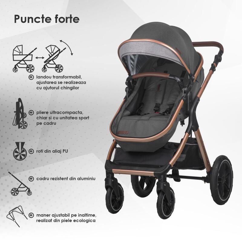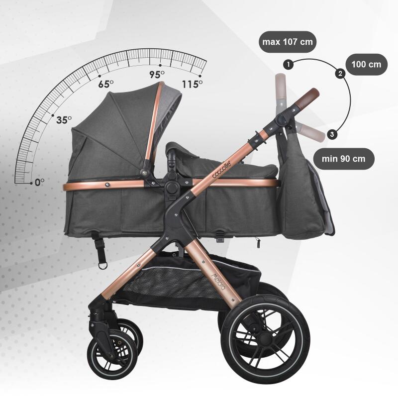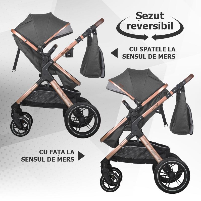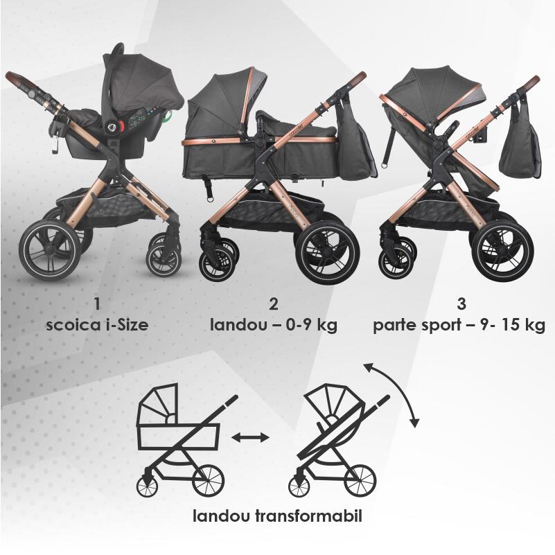 Atunci cand apare un bebelus in viata ta trebuie sa fi pregatit din toate punctele de vedere. Ce ai zice sa incepi cu un carucior versatil, util atat pentru tine ca si parinte, dar si pentru micutul tau. Caruciorul multifunctional Coccolle Melora este un set 3in1 complet, potrivit de la stadiul de nou-nascut si pana la aproximativ 3 ani. Fiind un carucior transformabil, landoul se poate converti usor in unitate sport si viceversa pentru a-ti conferi versatilitatea de care ai atat de mare nevoie in lumea moderna. Folositi produsul sub forma de landou in primele luni de viata atunci cand bebelusul are nevoie de o pozitie complet orizontala, urmand sa folositi in modul unitate sport atunci cand copilasul este pregatit sa stea singur in sezut. Transformarea caruciorului se va realiza facil, cu ajutorul unor chingi de sustinere, in 2 pasi simpli.