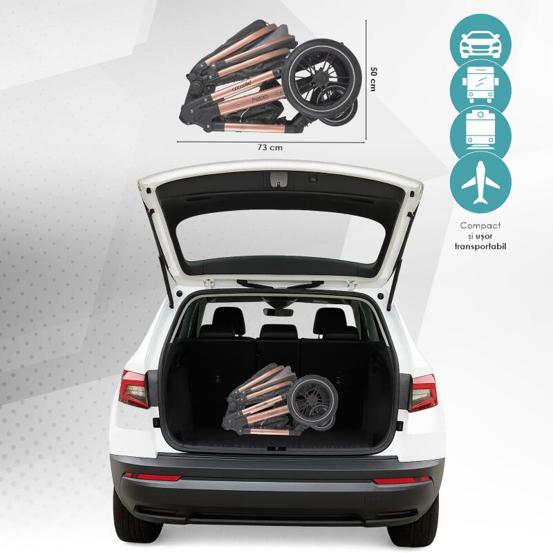 Pliere ultra-compacta: constrangerile legate de spatiu nu mai sunt o problema, deoarece caruciorul Coccolle Melora se pliaza foarte compact, inclusiv in cazul in care unitatea tranformabila ramane montata pe cadru. Gratie acestui mod de pliere, caruciorul isi gaseste loc in cele mai mici spatii de depozitare, in lifturile inguste, pe aleile micilor magazine sau chiar si in portbagajele masinilor mici. Plierea se realizeaza usor, iar caruciorul ramane in pozitie verticala dupa pliere.