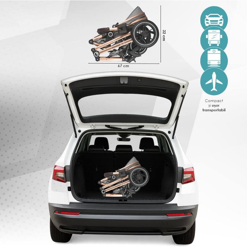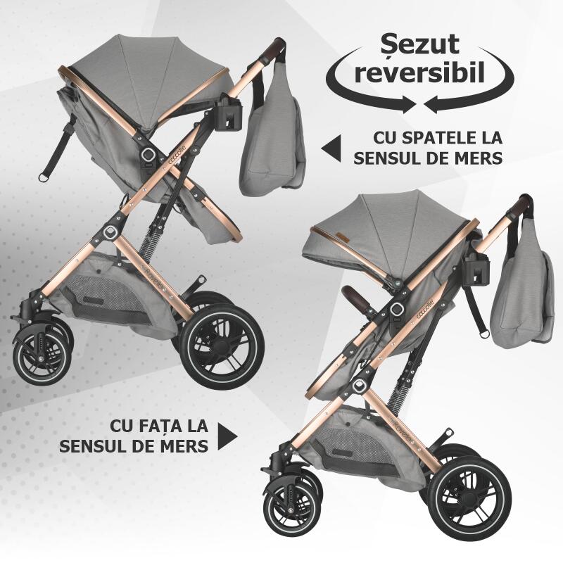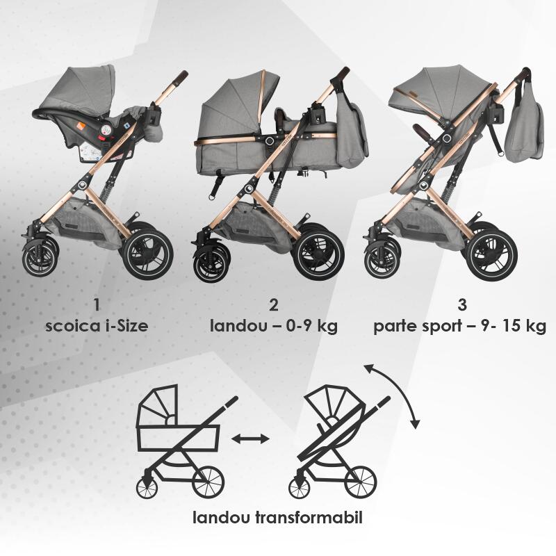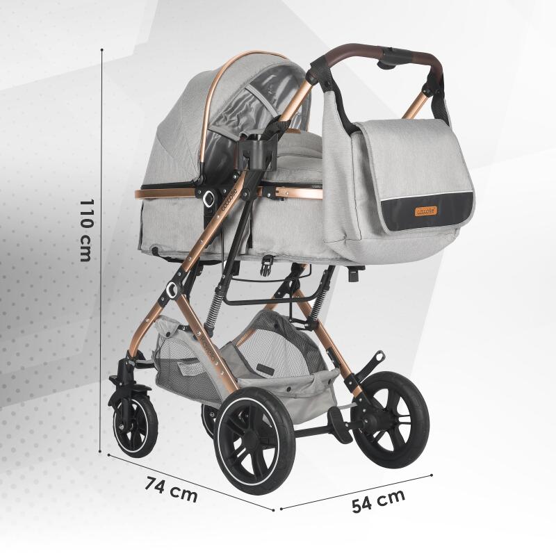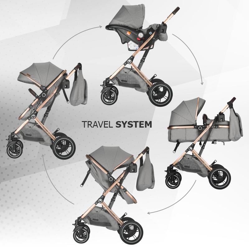 Caruciorul este format dintr-un cadru usor de aluminiu anodizat in culoare aurie, o unitate transformabila care se poate transforma din landou in unitate sport si viceversa in doar cateva miscari si un cosulet auto perfect atat pentru plimbarile cu masina, cat si scurtele escapade pe cadrul caruciorului.