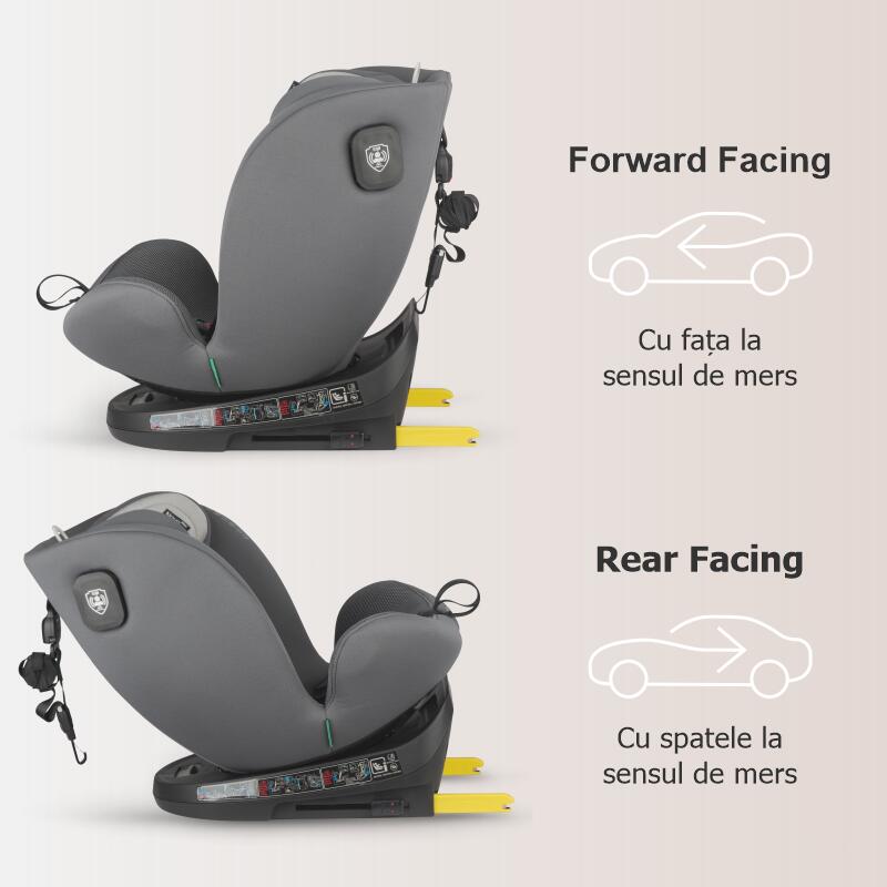 -instalare in masina cu ajutorul isofixului si a centurii top-tether; centura are eliberare rapida fara a fi necesara dezancorarea din masina